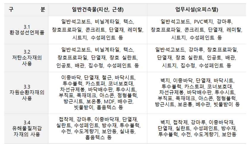 녹색건축인증의 다양한 평가 부분 중 재료 및 자원 분야의 비교를 통해 용도에 따른 인증자재 적용에 대해 알아보겠습니다.