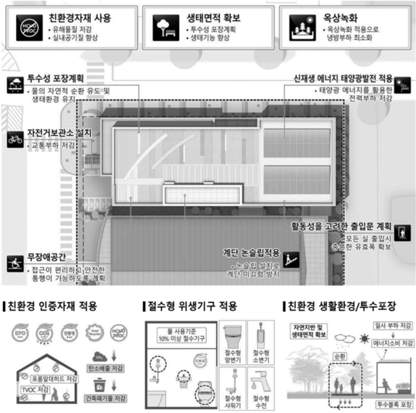 본 건축물은 주변환경 등에 조화를 이루며 이용자의 접근성 및 편의성을 고려하고, 누구나 이용이 편리하도록 계획하였다. 내외부 소음, 이용자 동선 등을 고려하고 편리성과 안전성 등을 고려하고 관리운영이 쉽고 운영비가 저렴한 에너지절약형 및 환경친화형으로 계획하였다. 친환경인증 수준은 최초 제안에서는 녹색건축 “우수등급” 이상, 에너지효율등급 “1++등급” 이상, 제로에너지건축물 “5등급” 이상, 장애물 없는 생활환경(Barrier Free) “일반등급” 이상이었으나 실제 제로에너지건축물 예비인증은 “4등급”을 취득하였다.