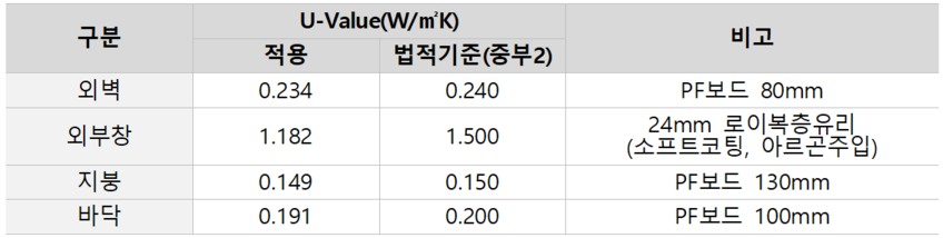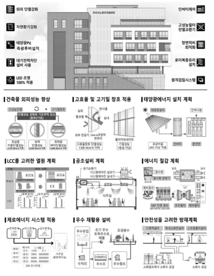 외피단열 강화 및 열교지점을 최소화하고 창면적비를 적정 계획하여 에너지요구량을 최소화하고 냉난방 시스템의 효율을 높여 에너지소요량을 최소화하였다. 일조 조건이 양호한 곳에는 태양광 시스템을 적급 계획하여 제로에너지건축물인증 4등급을 확보하였다.