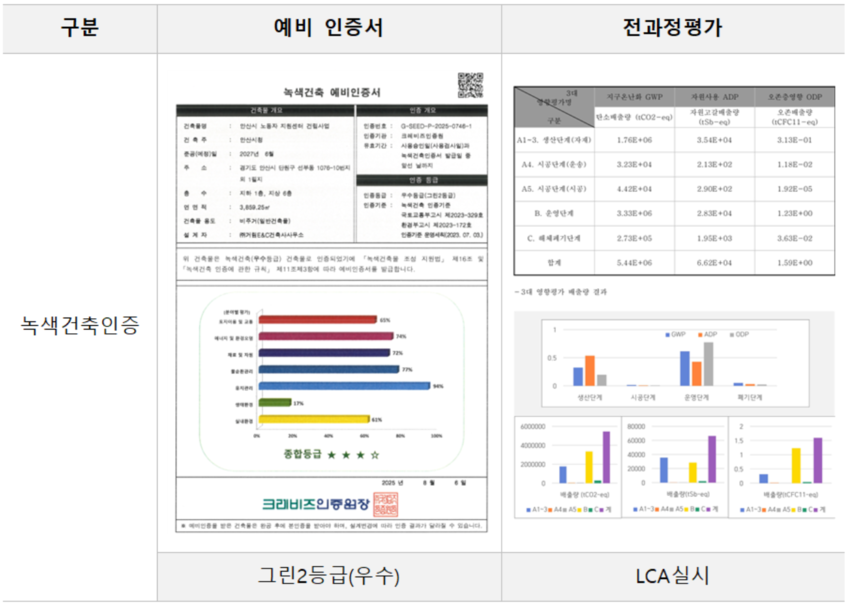 녹색건축인증의 경우, 자재부문에서 환경성선언제품, 저탄소제품, 자원순환 자재, 유해물질저감 자재 등을 적극 적용하였다. 또한 단열재 사용에 있어서는 오존층파괴지수(ODP)를 고려하였다. 수자원 측면에서는 빗물관리 면적을 90% 이상 계획하였고 옥상면 전체의 우수를 활용하는 우수조를 설치하였다. 생태조건이 불리한 도심에 위치함에도 생태면적률은 18% 이상 계획하여 도시 생태환경 향상을 고려하였다. 계획 초기 단계에서부터 본 건축물 조성으로 인한 지구온난화 영향, 자원소모 정도, 오존층영향 정도 등을 평가하였다. 이러한 평가는 자재 생산단계, 자재 운송단계, 시공단계, 운영 및 해체폐기단계를 구분하여 실시되었다.