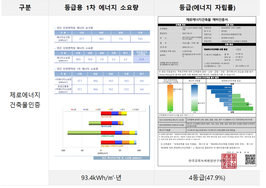 에너지 관련 인증의 경우, 예비인증 단계에서 제로에너지건축물인증 4등급을 획득하였다. 등급산출용 1차 에너지소요량은 93.4kWh/㎡·년, 에너지 자립률은 47.9%를 달성하였다. 적용된 신재생설비는 태양광발전으로 옥상형 PV가 69.3kW, 벽체 BIPV가 13.25kW 설치되었다.