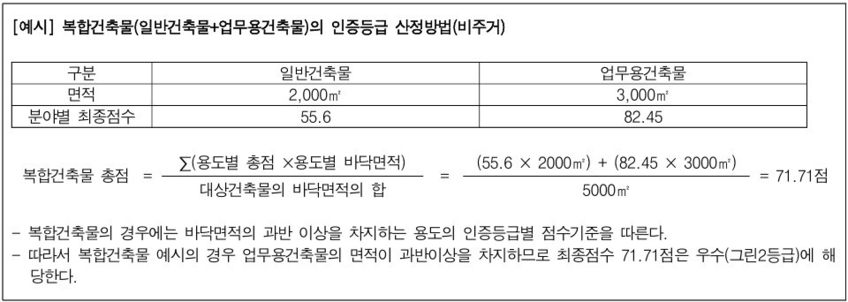 복합용도건축물로 인증 취득하였으며, 일반건축물(지식산업센터, 근린생활시설)과 업무시설(오피스텔) 용도로 일반건축물(80.4%)과 업무시설(19.6%)의 용도별 면적비율로 계산되어 합계점수 70점 이상입니다.