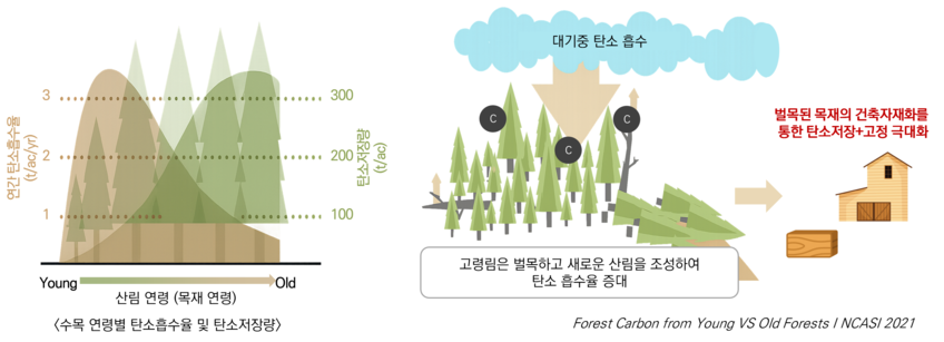NCASI (2021) 보고서에 따르면, 수목의 탄소흡수율은 약 20–40년령에서 최고조에 달한 후 급격히 감소한다. 따라서 고령림을 지속가능한 산림경영(Sustainable Forest Management) 원칙에 따라 계획적으로 관리·벌목하고, 새로운 산림을 조성하여 젊은 숲이 다시 성장하도록 하는 것이 탄소순환 활성화의 핵심 전략이다. 이러한 순환 체계는 “산림 → 벌목 → 건축자재화 → 신규조림 → 성장”으로 이어지며, 벌목된 목재는 건축물 속에서 장기간 탄소를 고정하고 새로 자란 숲은 이를 재흡수한다. 즉, 흡수–저장–고정의 탄소 선순환 구조가 완성되는 것이다.