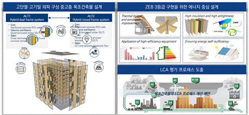 이러한 연구 흐름 속에서 외피 성능을 기반으로 한 ZEB(Zero Energy Building) 기반 에너지 설계 기술을 중고층 목조건축에 적용으로 확장하고 있다. 현재 국내 목조건축 기준은 주로 저층 건축물 위주로 정립되어 있어 중고층 규모에 적합한 에너지 성능 평가 기준과 설계 체계가 부재한 상황이다. 연구팀은 고단열·고기밀 외피 시스템과 열교 저감 설계, 고효율 설비 적용 전략을 통합한 에너지 효율 설계 프레임워크를 구축하고 있으며, ZEB 등급화 기준 체계화와 LCA(전과정평가) 기반 탄소 성능 평가 모델을 동시에 적용함으로써 에너지 성능과 탄소 저감 효과를 정량적으로 검증할 수 있는 표준화된 설계 가이드라인을 제시하는 것을 목표로 한다. 이러한 연구는 향후 중고층 목조건축 외피 성능 표준화와 국가 차원의 실증 설계 모델 개발로 이어질 것으로 기대된다.