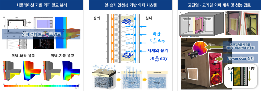 중고층 목조건축의 에너지 성능과 내구성 확보에 있어 외피 성능은 핵심적인 역할을 한다. 특히 목재는 재료 특성상 수분 민감성이 높아 열손실뿐 아니라 결로·곰팡이와 같은 열습기 리스크 관리가 중요하며, 건물 규모가 커질수록 외피를 통한 에너지 손실이 건물 전체 부하에 미치는 영향이 증가한다. 이러한 이유로 연세대학교 건축환경재료연구실 연구팀은 중고층 목조건축에 적합한 고성능 외피 체계 구축을 우선 과제로 설정하고, 투습·기밀·열교 제어를 통합한 외피 설계 기반 연구를 수행하고 있다. 외피의 열·습기 성능 실측 및 시뮬레이션(WUFI, EnergyPlus)을 활용하여 외피 구성(중단열 조합, 투습방수지, 레인스크린 시스템 등)의 장기 내구성과 에너지 성능을 평가하고 있으며, 이를 기반으로 실증 가능한 외피 시스템 표준안을 도출하고 있다.