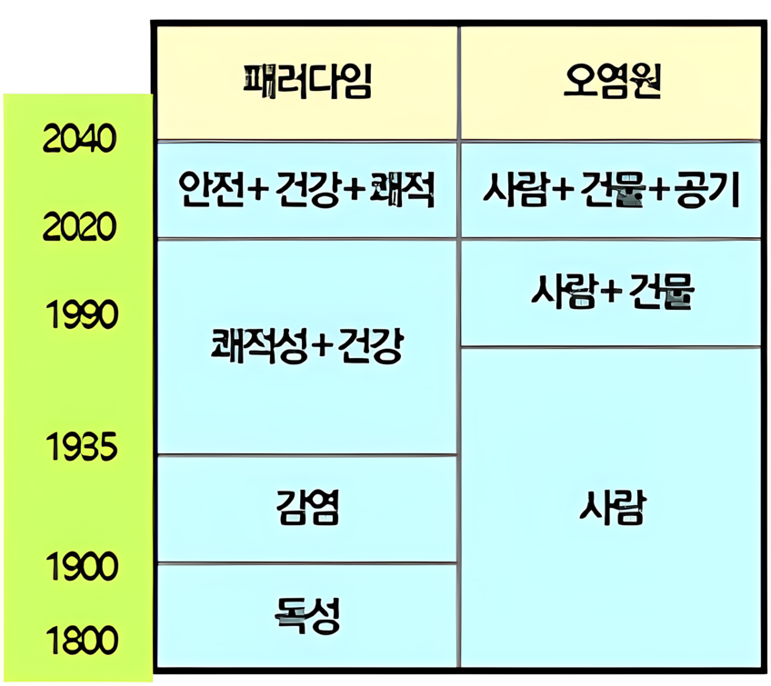 새롭게 등장한 초미세먼지, 코로나19 와 같은 실내공기 오염물질이 건축물과 실내공기환경에 어떤 영향을 미치고 있는지를 알기 위해서는 먼저 거주자의 생활과 활동패턴이 어떻게 바뀌었는지를 알아야 할 것이다. 그 이유는 건축물과 실내환경은 그것을 이용하는 이용자의 요구(user’s needs)에 따라 계획되고, 건설되며, 유지되기 때문이다. 그러나, 우리가 삶을 영위할 수 있게 해주는 3대요소인 衣食住 가운데 가장 바뀌기 어려운 것이 住라는 점을 감안하면 앞으로의 실내공기환경의 동향을 예측하기가 쉽지 않을 것이라는 점을 간접적으로 알 수 있다.