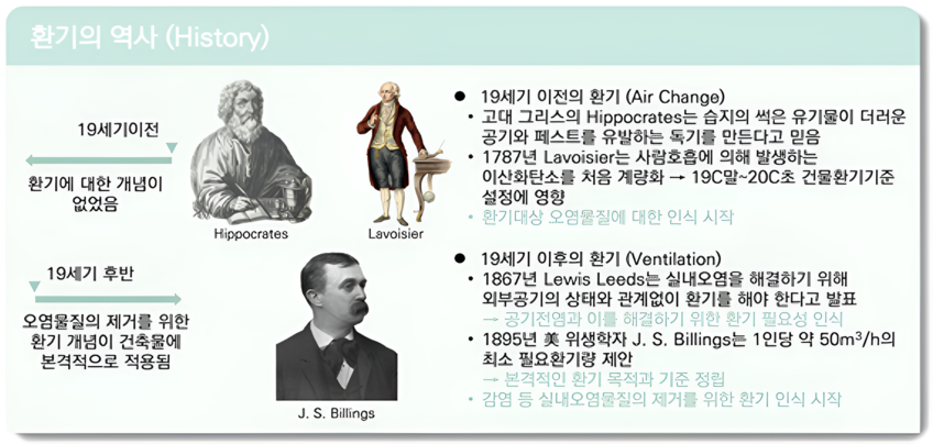 실내공기환경과 밀접한 관계를 갖는 이러한 환기는 18세기말 Lavoisier가 프랑스의 감옥과 공공장소에 대한 생리화학적 조사를 통해 사람의 호흡에 의해 발생하는 이산화탄소를 처음 계량화하고, 19세기초 이를 실내공기오염의 척도로 규정하는 필요환기량 개념으로부터 본격적으로 시작되었다고 할 수 있다. 이를 바탕으로 19세기 후반부터는 공기에 의한 전염병의 확산방지 수단으로 환기의 필요성을 인식하게 되었고, 1895년 미국의 위생학자인 John Shaw Billings가 전염병 예방을 위하여 1인당 최소 30cfm(=51m3/h)의 환기량이 필요하다고 제안하면서 본격적인 환기개념과 패러다임이 정립되었다고 할 수 있다.