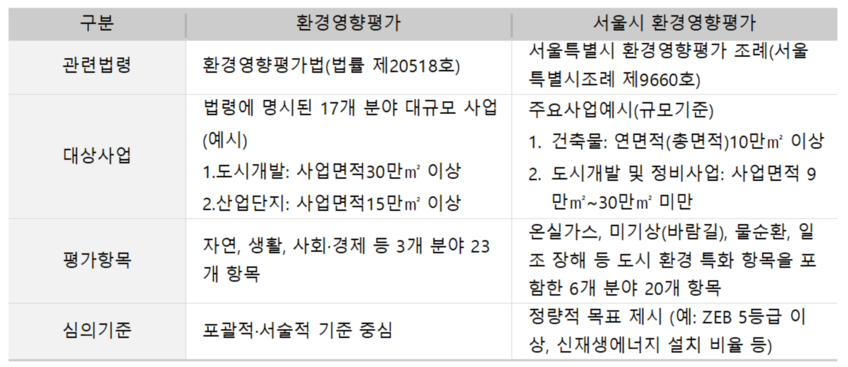 서울시는 국가 법령인 「환경영향평가법」을 기반으로, 대도시의 환경적 특수성과 선도적인 기후 정책을 반영한 「서울특별시 환경영향평가 조례」를 통해 한층 강화된 제도를 운영하고 있습니다.