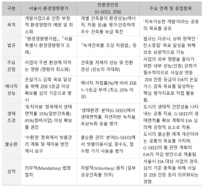 개발사업을 둘러싼 두 가지 핵심적인 친환경 제도는 바로 환경영향평가와 녹색건축인증(G-SEED) 및 제로에너지건축물(ZEB) 인증과 같은 친환경 인증입니다. 두 제도는 상호 보완적인 관계에 있으나, 그 목적과 법적 기반, 대상에서 뚜렷한 차이를 보입니다.