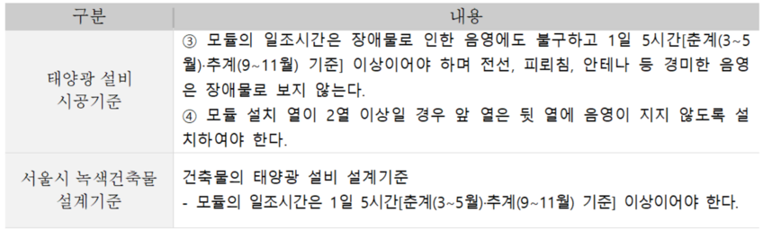 태양광 설비의 설치에 대한 기준은 신·재생에너지 설비 지원 등에 관한 지침과 서울시 녹색건축물 설계기준에서 다음 표와 같이 요구하고 있습니다.