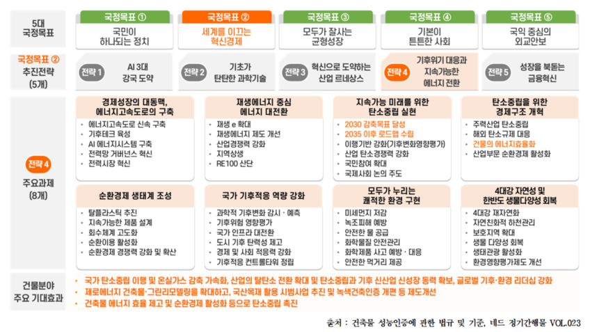 2025년 정부는 기후에너지부를 신설하여 기후위기 대응 및 에너지전환 정책을 체계적으로 추진해 나갈 계획으로 건물부문에 있어 신축건물은 제로에너지건축물 확대와 기존 건물의 그린리모델링 확대를 통해 건물부문의 탄소배출 수준을 2035년까지 2018년 대비 절반 수준인 47% 이상 감축을 목표로 하고 있으며, 2024년부터 2050년까지 88% 감축을 목표로 발표하였다.