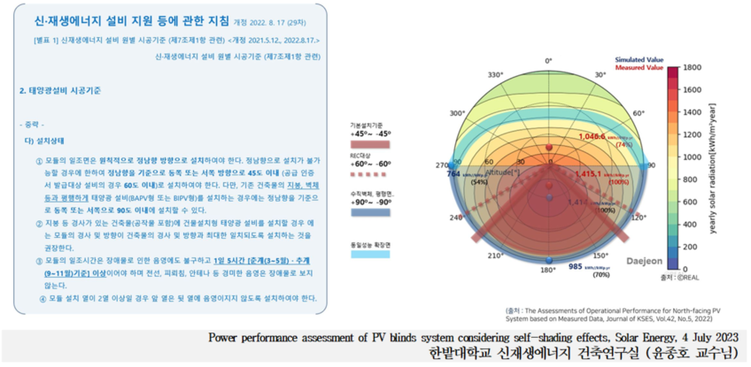 한밭대학교 신재생에너지 건축연구실(윤종호교수) 연구자료에 따르면 다양한 실측 결과와 노모그램을 통해 입증한 결과로, 보다 설치 여건이 용이할 수 있고, 보다 많이 연간 발전량을 기대할 수 있는 위치를 원천적으로 기준에 의해 배제시키고 있는 상황인 것으로 나타났다. 아래 제시된 노모그램에 따르면 굵은 하늘색 선에서 나타난 바와 같이 북향 조건에서 청색 굵은선 안쪽의 영역은 모두 정서향 또는 정동향 90도 설치보다 더 많은 발전량을 기대할 수 있는 조건임을 확인할 수 있으며, 최악 조건인 정북향 90도 조건에서도 최대 발전 설치조건 대비 약 1/3 ~ 1/4 정도의 연간 발전량을 기대할 수 있는 것으로 나타났다.