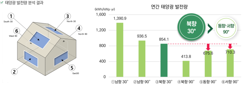 이에, 약 20도 정도의 경사각으로 북향 지붕면에 설치된 PV시스템의 연간 발전량은 남향 수직벽에 설치된 PV모듈의 발전량보다 더 많이 발전되고 있음을 확인할 수 있으며, 일반적으로 인식되고 있는 태양광 시스템의 북측면 설치 불가는 잘못된 선입견이며, 설치 경사각에 따라 북향면도 충분한 발전량을 기대할 수 있을 것으로 판단된다.
