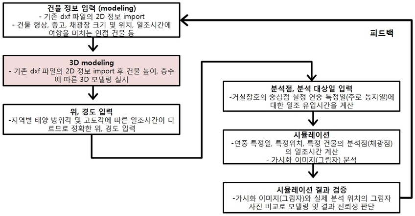 두 방법은 각각의 분석 특성에 따라 분석 결과에 일부 차이가 발생할 수 있으며, 어느 한 방법이 절대적으로 우수하다고 단정하기는 어렵다. 또한 법원은 일조권 분쟁과 관련된 판례에서 두 방법에 따른 분석 결과를 모두 타당한 근거로 인정하고 있다. 그림 2는 일반적인 일조권 분석 절차(Process)를 개략적으로 나타낸 것이다. 분석은 대상지의 기본 정보 입력을 시작으로 2D 도면자료 입력, 3D 모델링, 그리고 최종 분석 및 결과 확인의 순서로 진행된다. 이러한 체계적 분석 절차를 통해 보다 객관적이고 정량화된 일조환경 평가가 가능해진다.