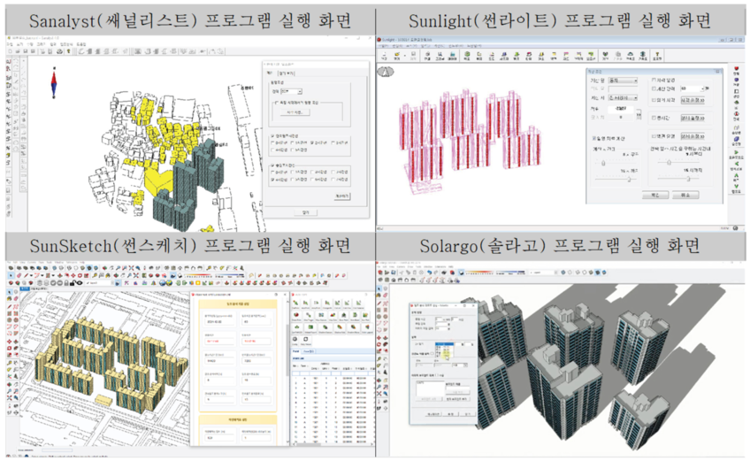 한편, 일반 기업에서는 상용화된 전문 일조분석 프로그램을 중심으로 실무에 적용하고 있다. 대표적인 프로그램으로는 Sanalyst(쌔널리스트), Sunlight(썬라이트), SunSketch(썬스케치), Solargo(솔라고) 등이 있으며 전문 환경분석업체, 건축설계사무소, 환경영향평가업체, 그리고 대형 건설사에서 폭넓게 활용되고 있다. 이 중 Sanalyst와 Sunlight는 프로그램 내부에서 3D 모델링을 직접 수행하는 방식으로, 자체 모델링 기능과 일조 분석 모듈을 통합적으로 제공한다. 이러한 일체형 구조는 모델링과 분석의 연속성을 보장하고 데이터 호환 과정을 단순화할 수 있다는 장점이 있으나, 초기 모델링 단계에서의 수정·보완 작업에는 다소 제약이 따르고 비정형적 건축물의 분석에 일부 어려움이 있다.