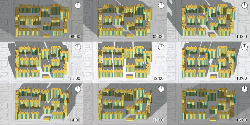 실제 일조분석 프로그램(SunSketch)을 활용하여 수행한 사례를 통해 일조환경 평가의 사례를 살펴보고자 한다. 분석 대상은 일반주거지역 내에 위치한 공동주택으로, 공동주택 계획 시 배치계획을 통한 단지 내부 일조영향을 검토하는 것을 주요 목적으로 하였다. 분석은 동지일 기준 오전 8시부터 오후 4시까지를 대상으로 수행하였으며, 일조시간 분포와 시간대별 음영을 살펴보았다. 그림 3에서는 분석대상 건축물의 3D 모델링을 통한 분석 결과 및 일조 확보시간을 그래프로 표현하였고, 그림 4는 시간대별 일조영역 변화를 나타낸 이미지를 제시하였다. 이를 통해 인접 건축물의 일조환경 변경정도와 그 영향 범위를 정량적으로 확인할 수 있었다.