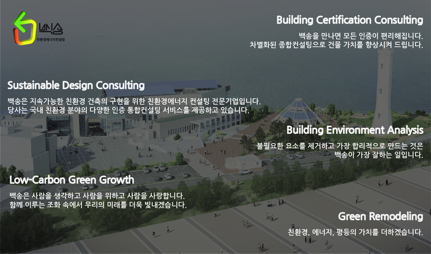 백송은 지속가능한 친환경 건축의 구현을 위한 친환경에너지 컨설팅 전문기업입니다. 당사는 국내 친환경 분야의 다양한 인증 통합컨설팅 서비스를 제공하고 있습니다.