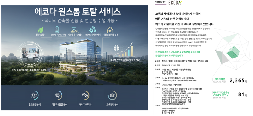 에코다(ECODA)는 급변하는 건축 및 도시 환경 속에서 지속 가능한 미래를 위한 최적의 친환경 융합기술 솔루션을 제공하는 국내 유일의 선도 기업입니다. 건축물 생애주기 전반에 걸쳐 환경, 에너지, 시뮬레이션 기술을 통합 관리하며, 고객의 복잡한 요구에 부응하는 차별화된 가치를 창출합니다.