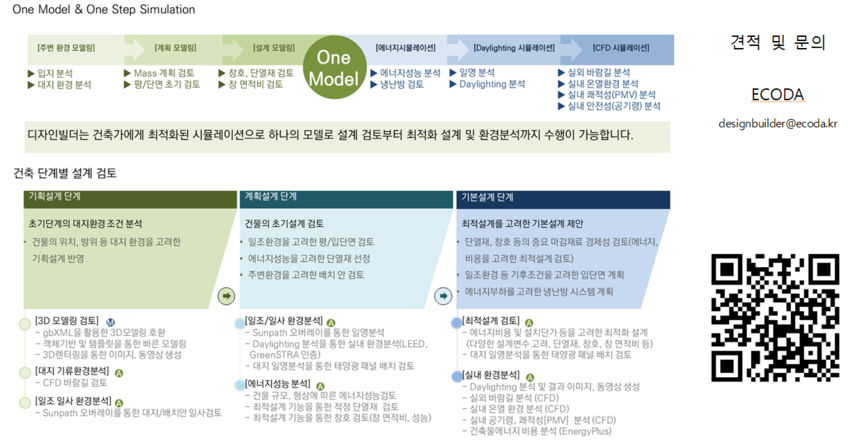 에코다는 DesignBuilder의 국내 공식 파트너로서, 소프트웨어 판매는 물론, 사용자들이 복잡한 에너지 분석을 손쉽게 수행할 수 있도록 전문적인 기술지원과 맞춤형 교육 프로그램을 제공합니다. 이를 통해 고객은 건축물 에너지 효율을 극대화하고 최적의 친환경 설계를 완성할 수 있습니다.