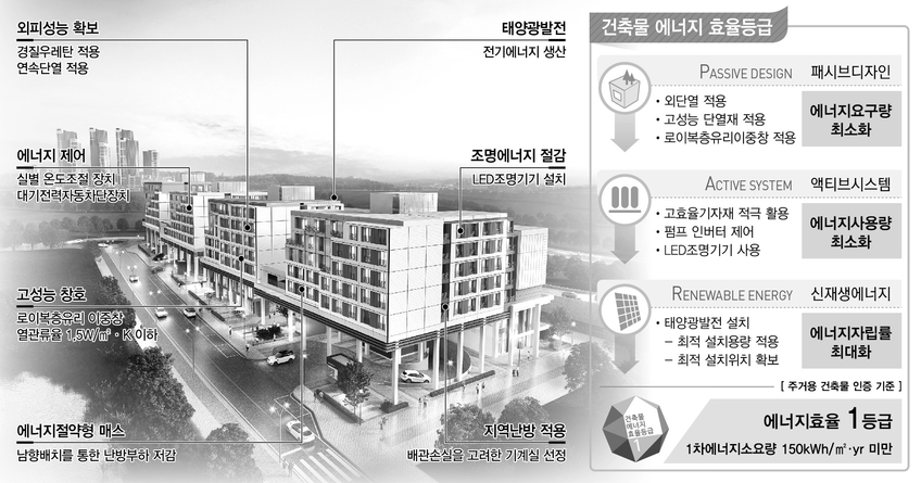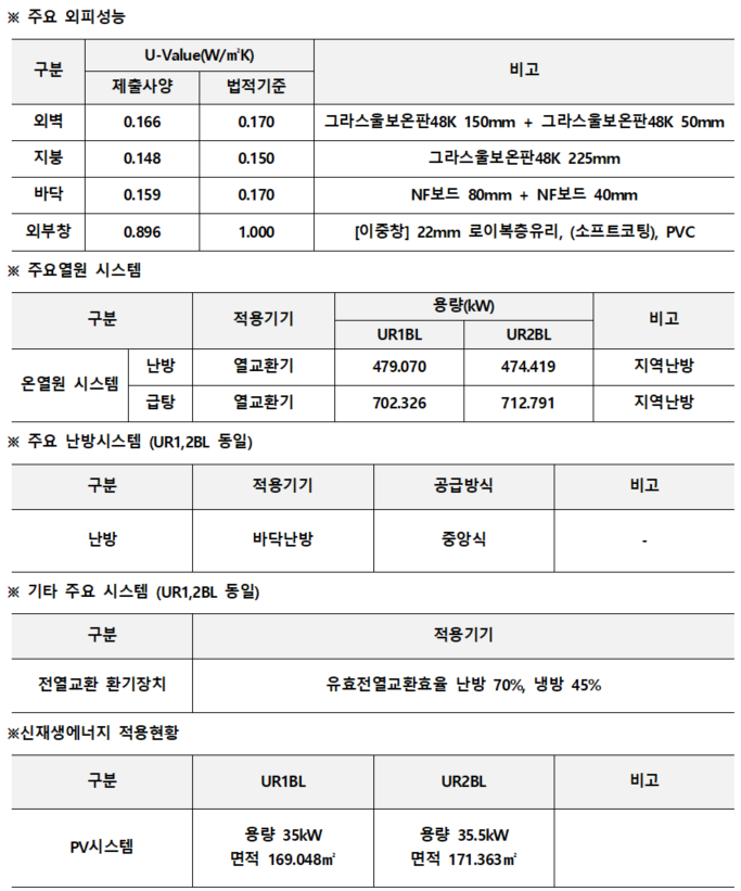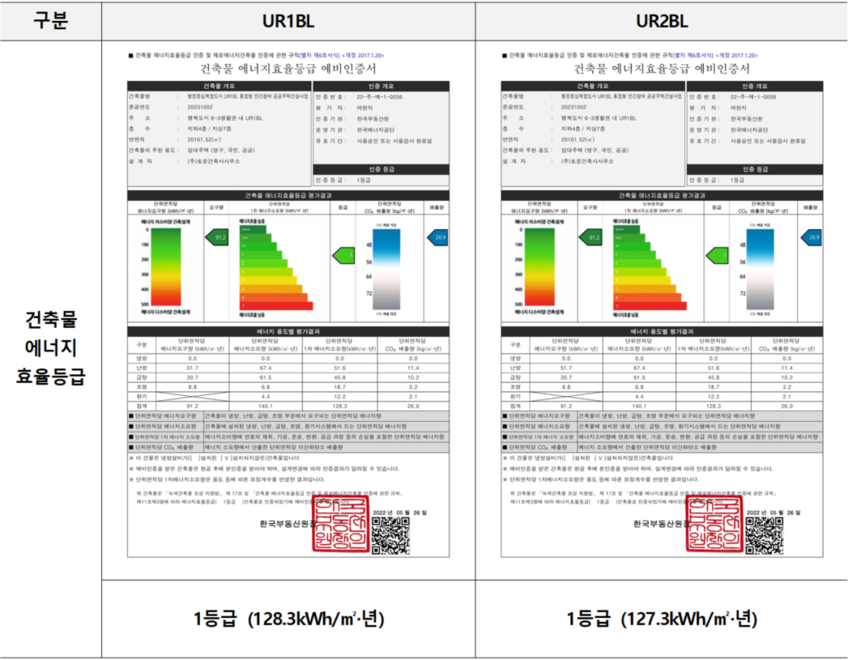 본 사업은 에너지 성능 강화를 핵심 목표로 설정하고, 예비인증 단계에서 UR1BL과 UR2BL 모두 건축물에너지효율등급 1등급을 획득하였다. 1차 에너지소요량은 UR1BL 128.3kWh/㎡·년, UR2BL 127.3kWh/㎡·년으로, 고효율 설비와 합리적인 에너지 계획을 통해 우수한 성능을 달성하였다.