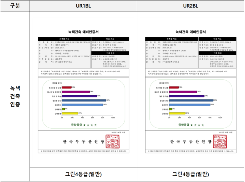 녹색건축인증(G-SEED)은 예비인증 단계에서 UR1BL과 UR2BL 모두 그린4(일반)등급을 획득하였다. 본 사업은 지구단위계획 부지에 위치하여 토지이용 및 교통 부문에서 가점 확보에 한계가 있었으나, 이를 보완하기 위해 자전거 주차장 설치 등 녹색교통 환경 조성을 통해 에너지 소비와 공해 발생을 줄이고자 하였다.