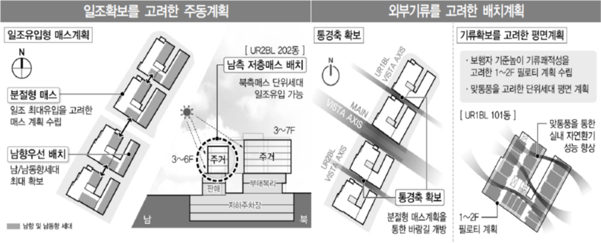 UR1·UR2BL은 패시브·액티브·신재생에너지를 단계적으로 적용한 에너지 절약형 공동주택으로 계획되었다. 강화된 단열 및 고성능 창호 적용을 통해 건물 외피 성능을 향상시키고, 고효율 전열교환 환기장치와 전 구간 LED 조명을 적용하여 에너지 요구량을 최소화하였다. 더불어 태양광 설비를 도입함으로써 에너지 자립 기반을 확보하였으며, 이러한 계획을 통해 두 블록 모두 건축물에너지효율등급 1등급을 획득하였다.
