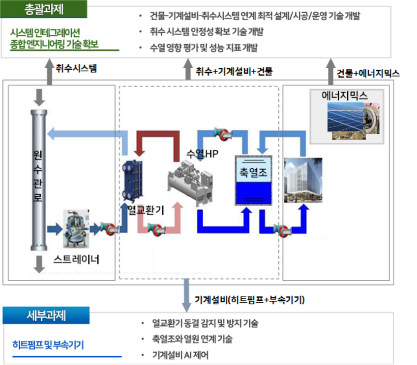 장한기술이 주관하는 세부 연구과제는 수열 시스템의 운전 효율 극대화를 목표로, 인공지능 기반 제어 기술과 동절기 저수온 대응 기술 개발에 집중한다. 수열에너지는 겨울철 수온이 5℃ 이하로 저하될 경우 열교환기 동결로 인한 성능 저하 및 설비 하자 위험이 존재한다.