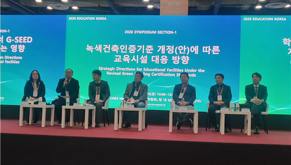 한국교육녹색한경연구원에서 주최하는 ‘2026 학술심포지움’이 1월23일(금) Coex전시장 B Hall 심포지움장에서 ‘녹색건축인증기준 개정(안)에 따른 교육시설 대응 방향’ 이라는 주제로 개최되었습니다. 본 협회 김학건 회장은 ‘녹색건축인증기준 개정(안)에 따른 녹색건축의 패러다임 변화 방향’에 대한 주제로 토론에 참석해 관련 현안에 대한 의견을 공유하였습니다.